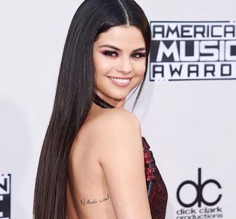 حرصت المغنية الأميركية سيلينا غوميز على إظهار الوشم المكتوب على ظهرها باللغة العربية "أحب نفسك أولاً"، خلال مشاركتها في حفل جوائز الموسيقى الأميركية والذي أقيم مساء أمس الأحد.