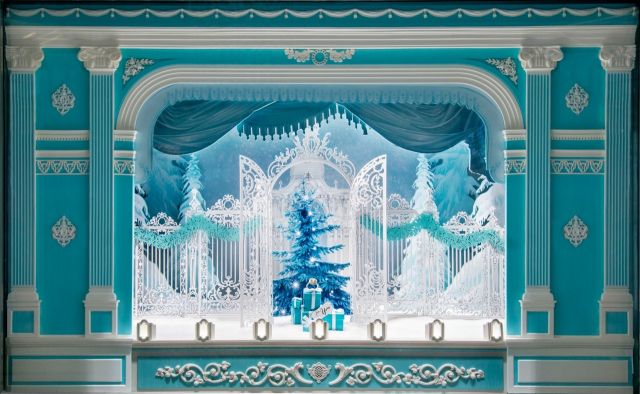 على شكل مقدمة مسرح مؤطرة بقنطرة مزخرفة، تأتي كل واجهة لتكشف عن مشهدٍ مأخوذ من الروايات والأساطير، مع حدائق شتوية، وجبال تحيط بقصرٍ مهيب. بين المشاهد المنوعة بوابات مزخرفة لفناء خارجي، تفتح لتظهر شجرةً كبيرةً مزينةً بتصاميم تيفاني؛ وسلّم كبير مزيّن بالأكاليل والهدايا؛ ورفّ موقد تعلوه العلب الزرقاء بانتظار اللقاءات حول النار في العيد؛ وجسر بعيد، هو المكان المثالي لعرض زواج مع خاتم خطوبة مرصّع بالألماس من تيفاني؛ ومزلجة ملكية تكدّست عليها الهدايا.
