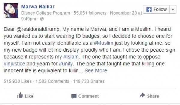 ونشرت مروى بالكر (22 عاماً) رسالتها عبر صفحتها الخاصة على موقع "فايسبوك"، موجهة إيهاها لترامب لترد على طلبه صناعة هويات خاصة بالمسلمين في الولايات المتحدة، وإنشاء قاعدة بيانات إلزامية لتعقبهم.