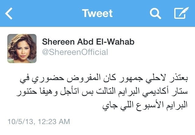 اعتذرت النجمة شيرين عن حضورها البرايم الثالث من برنامج "ستار أكاديمي" معلنة النجمة هيفاء وهبي ضيفة مكانها من خلال تغريدة أطلقتها عبر تويتر قالت فيها: