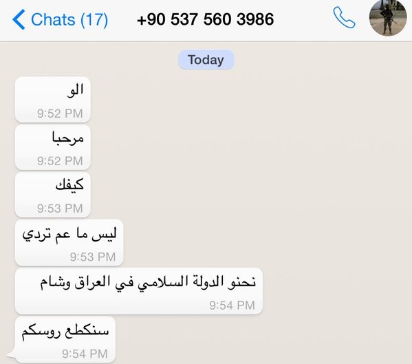 نشرت الإعلاميّة اللبنانيّة ريما نجيم صورتين على حسابها الخاص على "تويتر" لرسالة تهديد تلقّتها من أحد الأشخاص عبر تطبيق الواتساب عرّف عن نفسه بأنه من مقاتلي "الدولة الإسلاميّة" (داعش).
