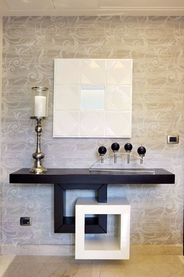 ضمن مساحة رائعة عند الردهة الرئيسة للمنزل، طاولة دائرية تتدلى فوقها ثريا عصرية بدوائر عدة تشكل نقطة الاستقبال الرئيسة، ومن حولها توزع كونسول أثري ومرآة بإطار عصري وبألوان بيضاء تسطّر جمال الأعمال الرائجة، وتتكامل مع ورق الجدران لتحجب قوة حضور اللون الأبيض.