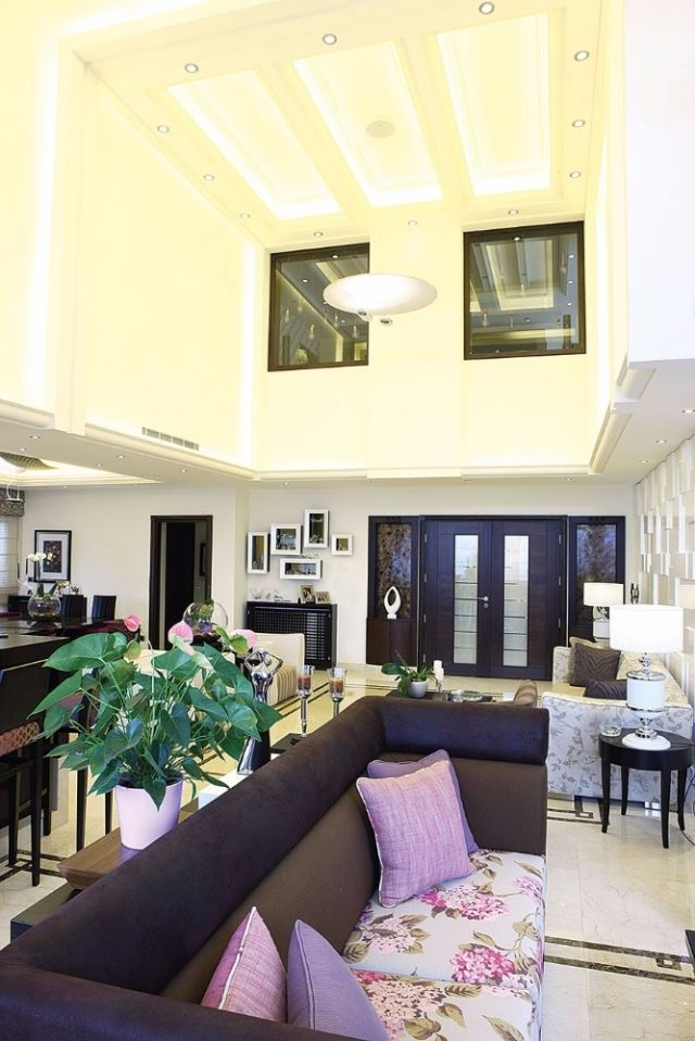 يبرز جمال الارتفاعات المزدوجة في سقف قسم الاستقبال فضاء من الأبيض مداه النور. هذه الأعمال من الجص حققها المهندس في السقف بمنحى كلاسيكي وبخطوط مميزة لتحتضن الأعمال العصرية للأثاث.