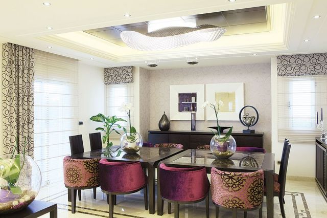 توزعت في غرفة الطعام طاولتان في طاولة واحدة نُفذت من الخشب مع سطح من رخام الـ «لامون» وكراس ذات قواعد ثلاث وبظهر منخفض. كما اختلفت تصاميم الكراسي عند رأسي الطاولة. وتتقابل الكراسي في تصاميم متناغمة ومعاكسة للأقمشة.