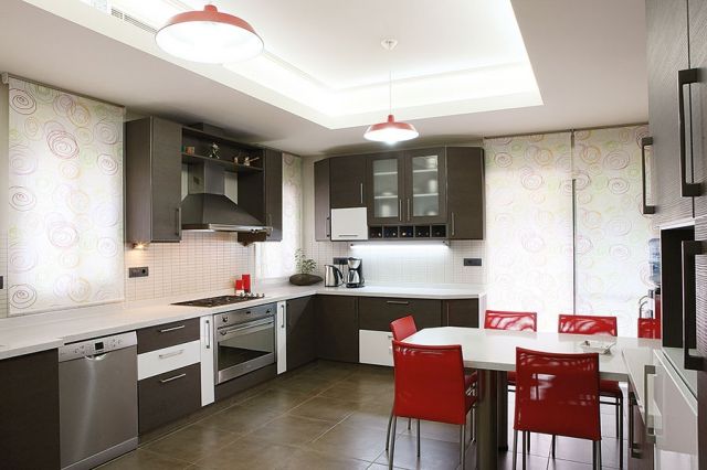 وتكتمل المساحة في هذا الطابق بمطبخ عصري مجهز بأحدث التقنيات العصرية والمريحة وباللونين الرمادي والأبيض مع ومضات باللون الأحمر اختارتها المالكة للكراسي والثريا.