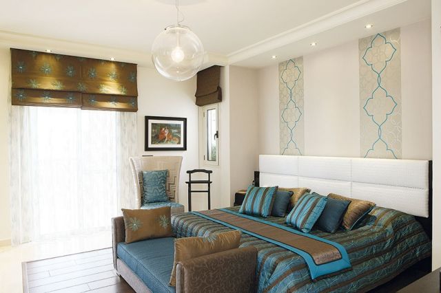تتوزع غرف النوم بأسلوب يعبّر عن ذوق ساكنيها. فغرفة المالكين اكتست باللونين الأزرق والبني الأثيرين لديهم، وبرزا على الأغطية والستائر وصولاً حتى ورق الجدران، مما أضفى جواً من الفخامة. كما أن تكراراً من أعمال الخشب الأبيض البوليستر شكل رفوفاً للإكسسوارات في هذه الغرفة.