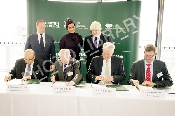 اجتمعت الشيخة موزا بنت ناصر، رئيسة مجلس إدارة مؤسسة قطر للتربية والعلوم وتنمية المجتمع بالسيد بوريس جونسون عمدة لندن والسيد إيد فيزي وزير الثقافة البريطاني، بمبنى بلدية لندن، حيث تمّ بحث آفاق التعاون المعرفي والثقافي المشترك بين مؤسسة قطر والمؤسسات التعليمية والبحثية في المملكة المتحدة. وأبدت الشيخة موزا تقديرها للدور الإيجابي لعمدة مدينة لندن في نشر وتعليم اللغة العربية كأساس للاهتمام الجاد بالثقافة والحضارة العربية. كما أكّدت التزام مؤسسة قطر بتعزيز آفاق التعاون المشترك، وعقد المزيد من الشراكات التي تعزز التبادل المعرفي، وتمّ تسليط الضوء على الفعاليات التي تقام خلال احتفالية «قطر- المملكة المتحدة 2013».