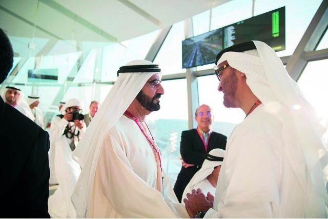 شهد الشيخ محمد بن راشد آل مكتوم نائب رئيس دولة الإمارات-رئيس مجلس الوزراء- حاكم دبي، والشيخ محمد بن زايد آل نهيان ولي عهد أبوظبي بحضور وفود وكبار الشخصيات من أنحاء العالم الجولة الختامية لسباق جائزة الاتحاد للطيران الكبرى للفورمولا 1 أبوظبي 2015 على مضمار حلبة «مرسى ياس».