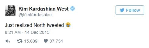 نُشر على الصفحة الرسمية لنجمة تلفزيون الواقع كيم كارداشيان على موقع "تويتر" تغريدة غريبة أثارت الكثير من التعليقات ليتبين فيما بعد ان من نشرها ابنتها نورث ويست، التي تبلغ من العمر عامين فقط.