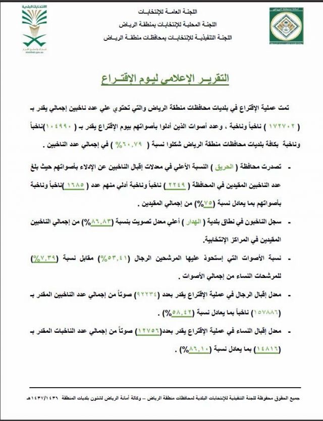● وبالحديث مع المُرشحة الفائزة في انتخابات المجالس البلدية، سيدة الأعمال السعودية هدى بنت عبدالرحمن الجريسي، وصفت لنا الإقبال يوم انتخابات المجالس البلدية «بالضعيف لكلا الطرفين، سواء من الرجال أو النساء. وكمشاركة هي الأولى للمرأة، لا أجده ضعيفاً، ففي الترشح والتصويت كان العدد كبيراً جداً، مقارنة بالرجال. كبداية، كانت الأعداد لا بأس بها».