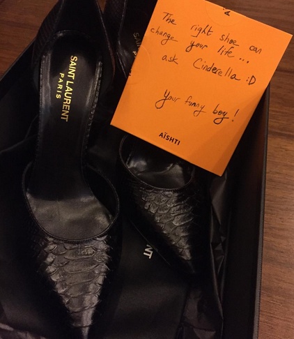 والهدية عبارة عن سكربينة سوداء جميلة وأنيقة وكتب على ورقة صغيرة اهداء: "الحذاء الصحيح يمكن ان يغيّر حياتك.. اسألوا سندريلا"، في إشارة منه إلى أن سيرين شبيهة سندريلا.