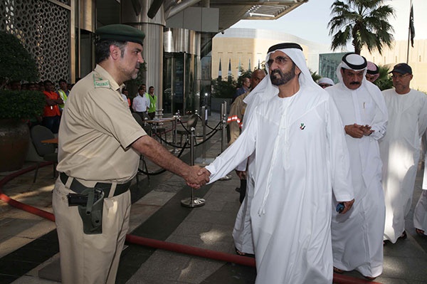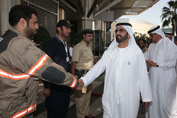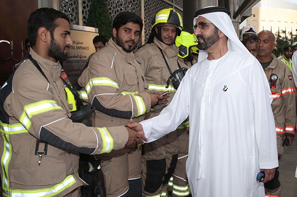 أشاد الشيخ محمد بن راشد آل مكتوم نائب رئيس دولة الإمارات-رئيس مجلس الوزراء- حاكم دبي بالأداء البطولي المشرّف الذي تميزت به فرق الدفاع المدني والشرطة والإسعاف والكفاءة المهنية في تعاملهم مع الحريق الذي اندلع في فندق "العنوان" بالقرب من برج خليفة الأعلى في العالم قبل ساعتين من الاحتفال الشهير الذي يقام فيه بمناسبة حلول العام الجديد، مؤكداً قدرة أبناء الإمارات على التعاطي الفعال مع المواقف الطارئة بكفاءة منقطعة النظير.