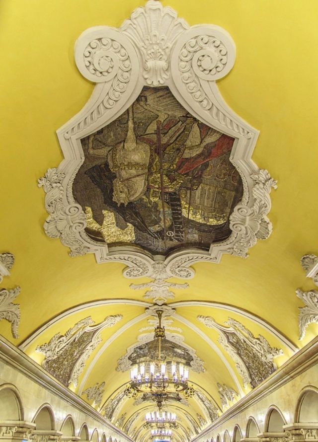 فيما اللوحات التي تجتاح جدران المحطة مستوحاة من خطاب ستالين عام 1941 خلال استعراض الجيش الأحمر، فهي تعكس قوة الجند، والساعات العظيمة «للقتال من أجل الحريّة» في الاتحاد السوفياتي السابق.