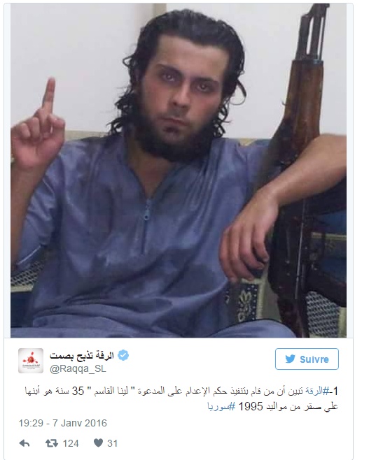 واتهم "داعش" السيدة بالردة، زاعماً أنها كانت تحرض ابنها على مغادرة الدولة التي أسسها داعش، وأرادت أن تهرب معه، وأشار ابنها إلى أن والدته قالت له إن التحالف الدولي سيقتل كل أفراد التنظيم. وأفادت قناة "روسيا اليوم" أن الأم تدعى لينا القاسم.