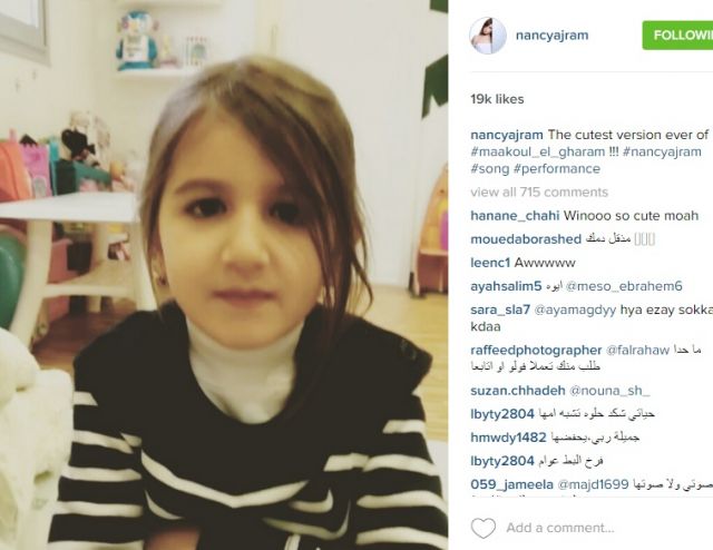 نشرت النجمة اللبنانية نانسي عجرم مقطع فيديو عبر حسابها في "انستغرام" لابنتها إيلا تغني فيه أغنية الأم "معقول الغرام".
