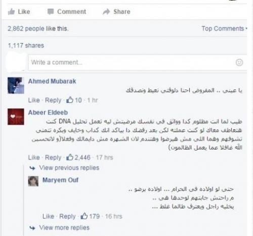 وجاء في التعليق: "طيب لما انت مظلوم كدا وواثق في نفسك مرضيتش ليه تعمل تحليل DNA كنت هتعاطف معاك لو كنت عملته لكن بعد رفضك دا بيأكد انك كداب وخايف وبكره تتمنى تشوفهم وهما اللي مش هيرضوا وهتندم لان الشهره مش دايمالك وفعلاً".