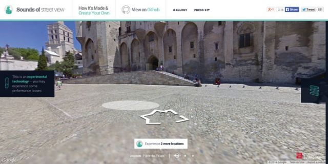عند استخدام خرائط غوغل، يُمكن المستخدمة دائماً تفعيل ميّزة Street View والتي من خلالها يُمكن استعراض بعض المناطق التي تتوافر لها بعض الصور ثلاثية الأبعاد. لكن هذه الصور وإن كانت ثلاثية الأبعاد، إلا أنها لاتوفر أصواتاً أو تفاعلية. لذا يُمكنكِ تجربة موقع Sounds Of Street View الذي يسمح باستخدام ميّزة Street View مع تشغيل أصوات من الموقع الذي يختاره المستخدم. بعد الدخول إلى الموقع وتحميل الخرائط، إضغطي على Experience the tour لتظهر لك بعض المواقع بوضعية Street View وأصوات مرافقة للمنظر.