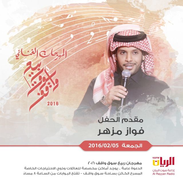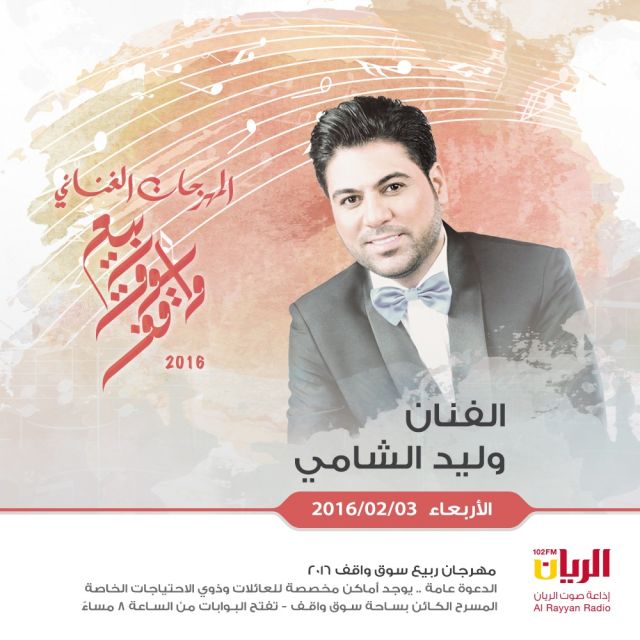 ينطلق مهرجان "ربيع سوق واقف" الذي يستقطب كافة الشرائح العمرية المختلفة من خلال تنوّع فعالياته التي تقدّم للكبار والصغار وتجذب مختلف الجنسيات، يوم الجمعة في 22 يناير الحالي ويستمر حتى 5 فبراير، ويتضمّن حوالى 27 فعالية تقدّم 61 عرضاً يومياً موزّعة على عدة أماكن بسوق واقف، إلى جانب الحفلات الغنائية التي تنظّمها إذاعة "صوت الريان" ويشارك فيها 29 مطرباً خليجياً وعربياً، يحيون 15 ليلة غنائية على هامش المهرجان، حيث سبق لبعضهم المشاركة في الدورة الماضية "الثالثة" مثل أخطبوط العود عبادي الجوهر وعبدالله الرويشد وديانا حداد وصابر الرباعي وكاظم الساهر وفارس كرم، واستمرارية صعود فنان العرب محمد عبده والقطري علي عبدالستار في ختام المهرجان كالمعتاد وعودة بعض الأسماء التي شاركت في المواسم السابقة كالنجمة المغربية أسماء المنور التي شاركت في الثاني وعاصي الحلاني الذي شارك في الموسم الأول من انطلاقة المهرجان، فيما يطلّ البعض الآخر لأول مرة مثل الفنان سعد لمجرّد وإنصاف مدني وصلاح بن البادية وسميرة سعيد ولطفي بوشناق الذي ينتظر أن يحيي الحفلة الثالثة من المهرجان.