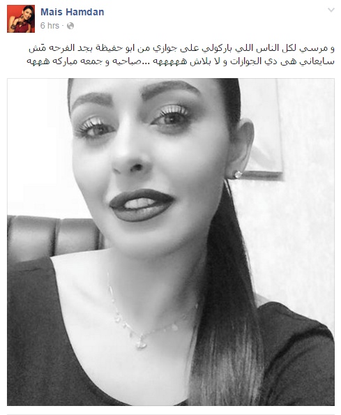 وأضافت ميس في تدوينه لها على "فايسبوك": "مرسي لكل الناس اللي باركولي على جوازي من أبو حفيظة، بجد الفرحة مَش سايعاني هي دي الجوازات ولا بلاش ..صباحية وجمعة مباركة".