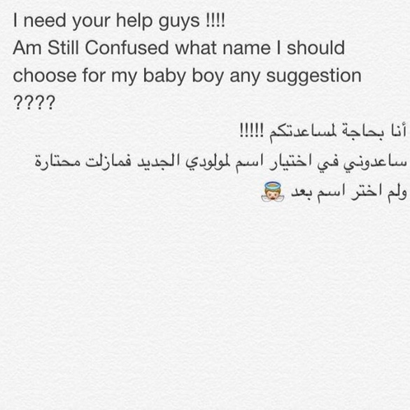 ونشرت الفنّانة اللبنانية عبر حسابها على "انستغرام"، صورة تقول فيها: "انا بحاجة لمساعدتكم!!!!! ساعدوني في اختيار اسم لمولودي الجديد، فما زلت محتارة ولم اختر اسم بعد".