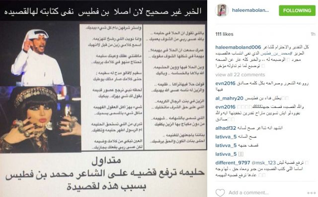 وعلقّت بولند على القصيدة التي نشرتها عبر تطبيق "انستغرام": "كل التقدير والاحترام للشاعر العزيز محمد بن فطيس الذي نفى انتساب هالقصيده الوضيعه له ،، والخبر كله عار عن الصحه، مجرد توضيح لما تم تداوله مؤخراً.