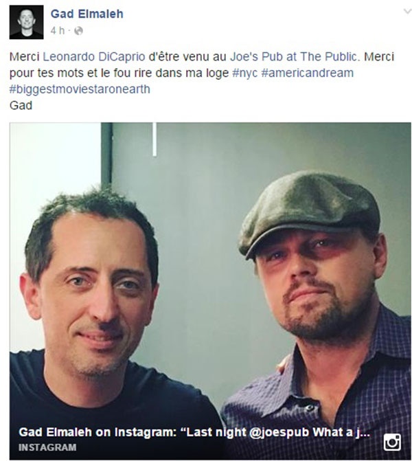 عبّر الكوميدي المغربي المعروف جاد المالح من خلال صفحته الرسمية في موقع التواصل الاجتماعي "فايسبوك" عن سعادته بلقاء نجم هوليوود ليوناردو دي كابريو، في كواليس العرض الساخر الذي قدمه جاد في نيويورك.