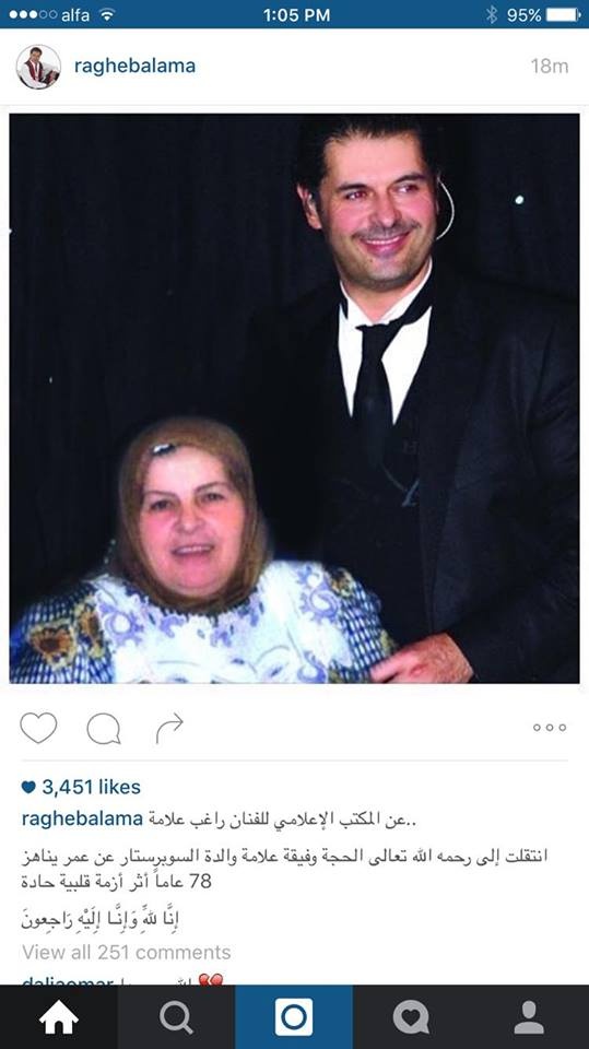 نشر السوبر ستار راغب علامة صورة له مع والدته ليعلن للجميع وفاة ست الحبايب. وكتب المكتب الإعلامي لعلامة على حسابيه على موقعي تويتر وفايسبوك: "انتقلت إلى رحمه الله تعالى الحجة وفيقة علامة والدة السوبرستار عن عمر يناهز 78 عاماً أثر أزمة قلبية حادة " نتمنى لراغب الصبر والسلون ولوالدته حسن الخاتمة.