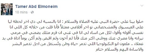 وأكمل: "أقول لكل من أساء لي أنا في غنى أن قزم مثلك يضعني في مرمى نيرانه، وأنا مصري عنك ووطني أكتر منك فأنا لم أخون ولم أقبض ولم أكن يوماً أداة في يد عملاء... ملعون أبو التكنولوجيا اللي تدمر حياة وطن وتٌستغل من أجل تدمير البشر والإساءة إليهم والسلام ختام."