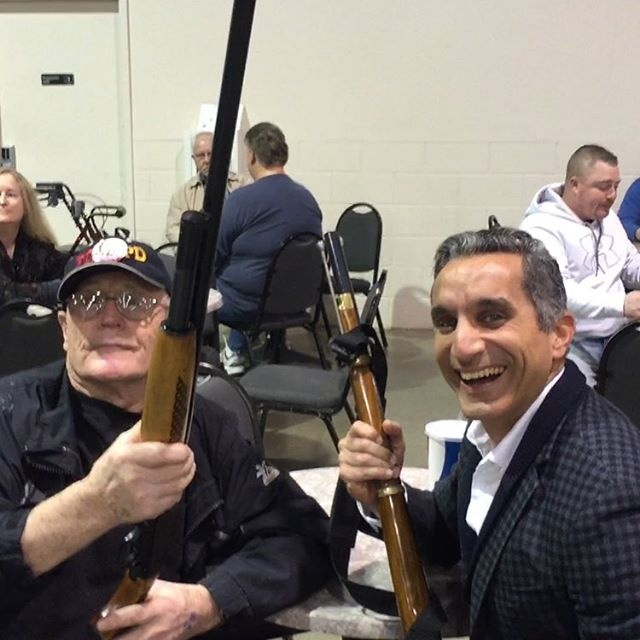 نشر الاعلامي المصري باسم يوسف عبر حسابه على "إنستغرام"، بعض الصور من كواليس برنامجه الجديد "دليل الديمقراطية"، وهو يحمل السلاح ويرتدي ملابس عسكرية .