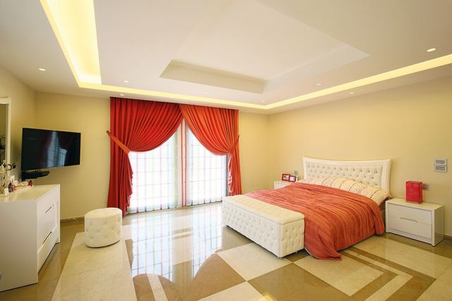 يرتفع ظهر السرير الكبير من الجلد الأصلي مزيّناً بأغطية ووسائد من أجود أنواع الأقمشة، وتتوزّع حوله الخزائن بجانب الجدران عاكسة اللون العاجي بفخامة حتى لا تسبب أي ازدحام داخلها. وأمام السرير تموضع التلفاز في وسط الخزانة الرئيسة الكبيرة.