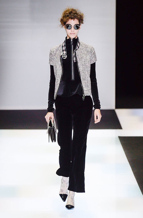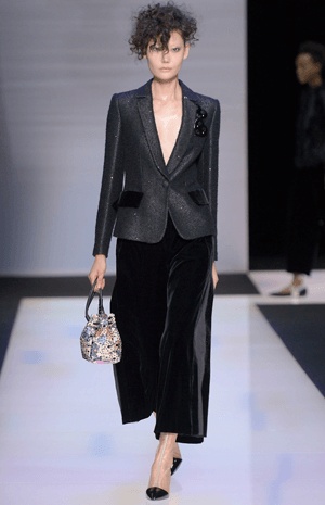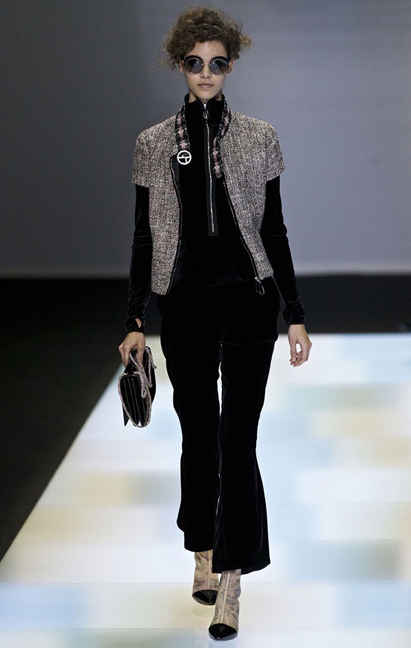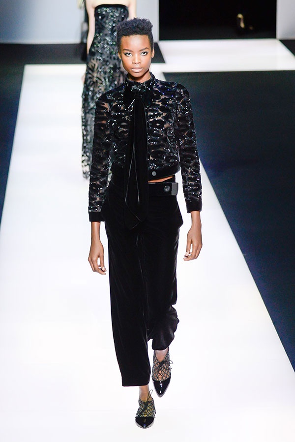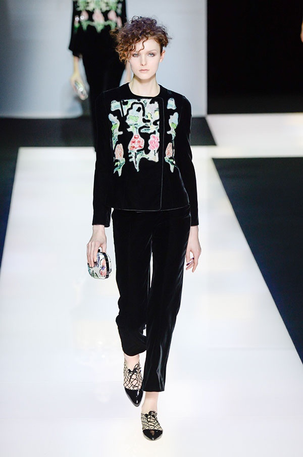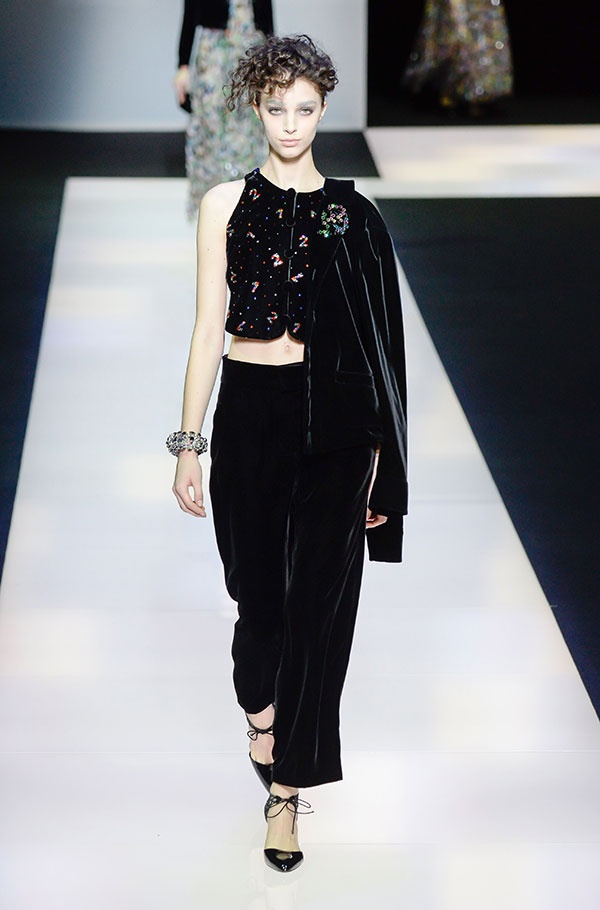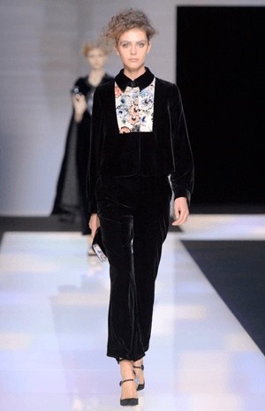 وتميّزت مجموعة أرماني لخريف 2016 بحضور قماش المخمل الأسود في جميع التصاميم، فظهرعلى شكل سراويل نسقت مع سترات متنَّوعة الأقمشة والقصات.