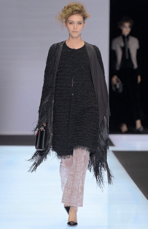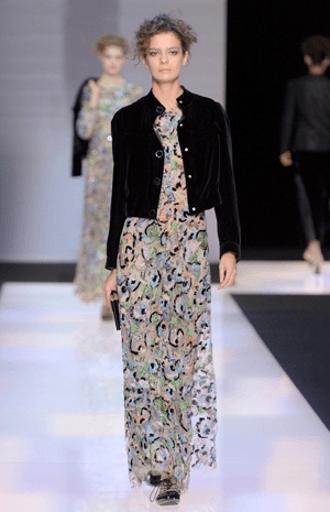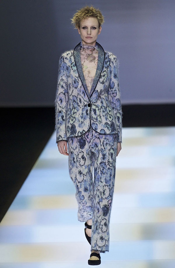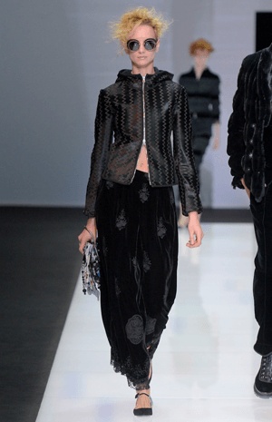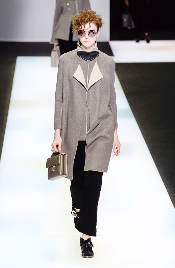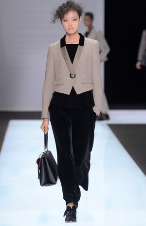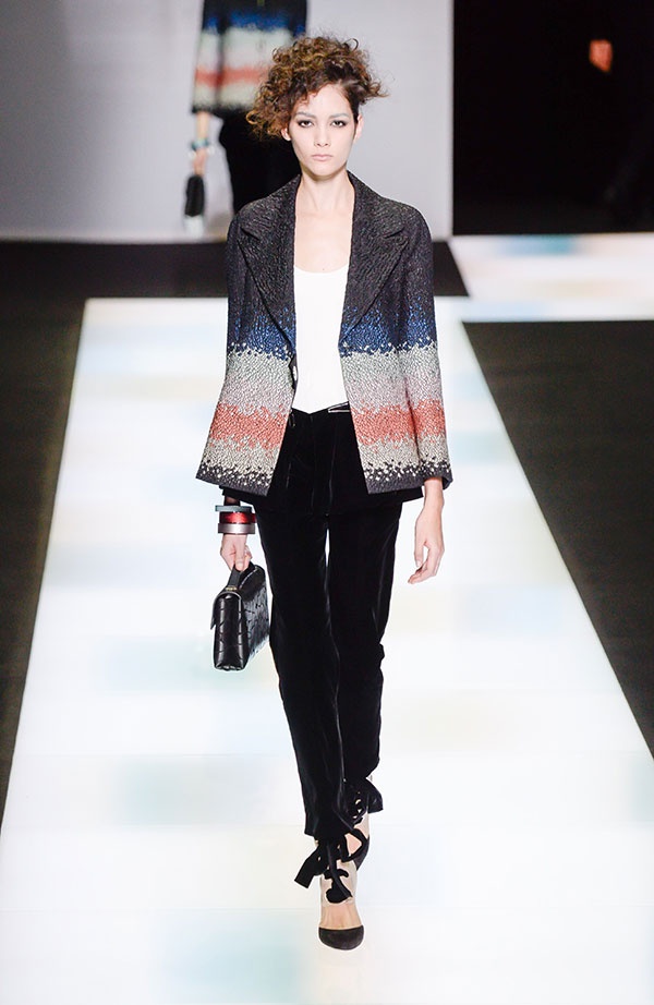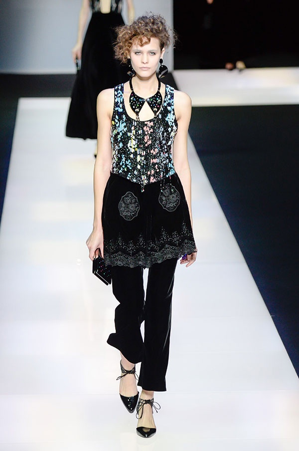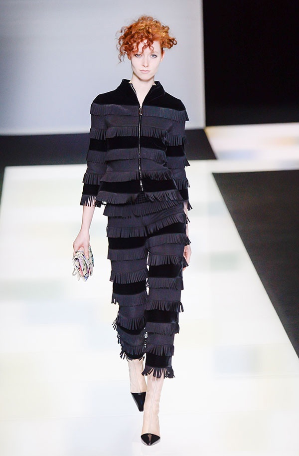 وتميّزت مجموعة أرماني لخريف 2016 بحضور قماش المخمل الأسود في جميع التصاميم، فظهرعلى شكل سراويل نسقت مع سترات متنَّوعة الأقمشة والقصات.