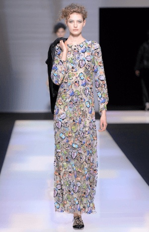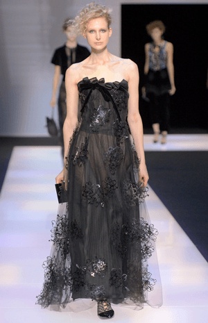أما بما يختص بالسهرات فخصص أرماني لهذه المجموعة عدداً من الجامبسوت مع الكابات وفساتين بقصة التنانير الواسعة والكتف الواحد التي طغى عليها سحر المخمل الأسود وغيرها، ميّزها بأحزمة مخملية عريضة ملتفة حول الخصر أو عند الياقة.