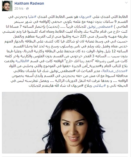 وقال هيثم رضوان الصحافي في جريدة الشروق على صفحته فى موقع التواصل الاجتماعى "فايسبوك"، إن "الظابط اللي اعتدي علي #مريهان هو نفس الظابط اللي اعتدي #عليا وحجزني في القسم 9 ساعات بدون تهمه مع علمه بكوني صحفي، الواقعه في شهر ايلول (سبتمبر) الماضي".