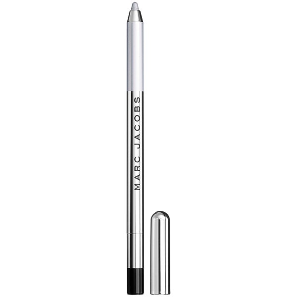 ● خطّطي الجفن الداخلي للعين بالقلم الفضيّ Marc Jacobs Beauty Highliner N(Ice) Silver with Shimmer، وحدّدي جذور الرموش العليا بقلم الأيلاينر الأسود Clinique Pretty Easy Liquid Eyelining Pen.
