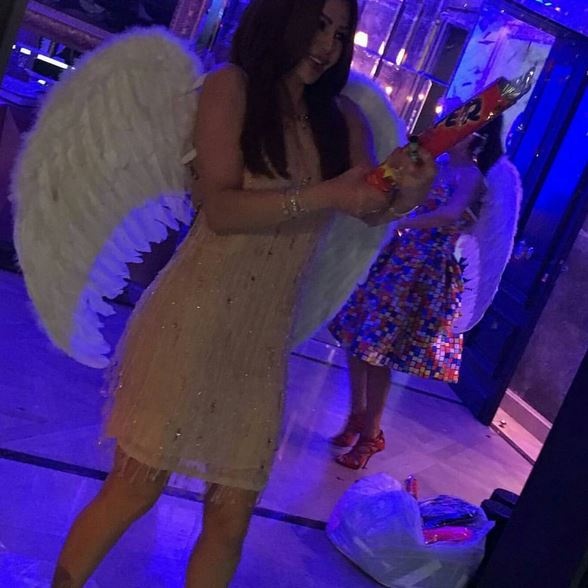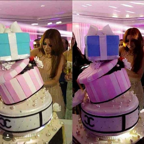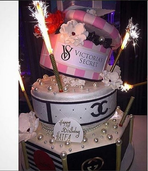 والملفت في السهرة، كان قالب الحلوى الذي تألّف من طبقات عدة لأهمّ الماركات التجارية المعروفة في العالم مثل فيكتوريا سيكرت وشانيل وغوتشي.