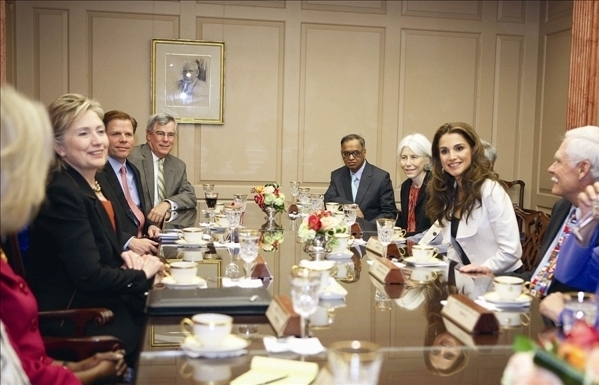 وتبادلت الملكة رانيا الحديث مع الطلاب حول خبرتها في الدراسة، وعرّفتهم بالأردن وموقعه وما يتطلع اليه الطلاب فيه من أجل الانخراط في الحياة العملية. كما حدثتهم عن لقائها سيدة أميركا الأولى ميشيل أوباما، وقالت «إن الرئيس والسيدة أوباما يعملان بجد لأنهما يحبانكم كثيراً، وعليكم مساعدتهما من خلال العناية بمدرستكم وبلدكم». وفي وقت لاحق شاركت الملكة رانيا بصفتها عضو مجلس إدارة مؤسسة الامم المتحدة في الاجتماع الدوري للمجلس الذي عقد بحضور وزيرة الخارجية الاميركية هيلاري كلينتون وتيد تيرنر رئيس مؤسسة الأمم المتحدة وأعضاء مجلس إدارة المؤسسة في واشنطن.