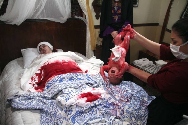 وبدت إسبر في الصورة بلحظة وضع جنينها، شاحبة اللون وعروق وجهها نافرةً جداً، في لقطة من مشاهد مسلسل "خاتون" الشامي الذي تؤدي فيه شخصية "درية".