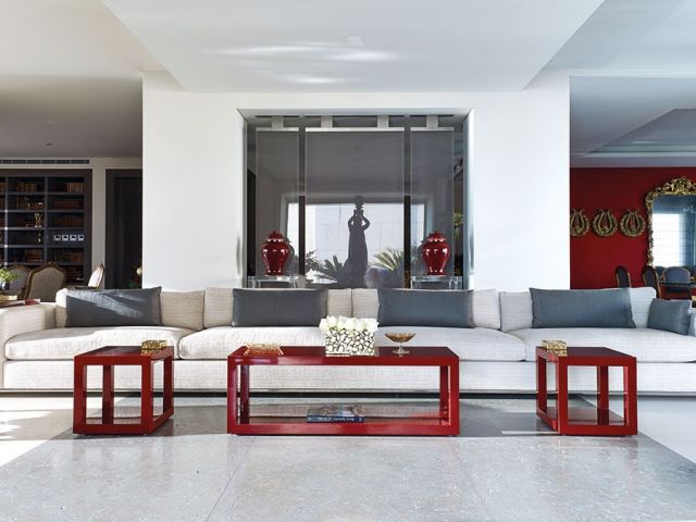 وخلف المقعد زهريتان باللون الأحمر وضعتا على طاولتين مستطيلتين من الزجاج، وخلفهما ستار شفّاف يفصل بين الصالونات. ويقول المهندس: «استخدمت هذا النوع من الستائر للفصل بين الجلسات بطريقة تضفي خصوصية على كلّ ركن وتحفظ الشفافية في آن معاً. كما انسدل القماش الشفاف كستائر على الواجهات الزجاج الكثيرة في الشقة، ليدخل منها أكبر كمّ من الضوء» .