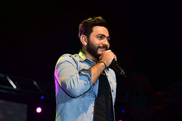 صعد نجم الجيل المسرح في تمام الساعة التاسعة مساء على أنغام أغنية “كل اللهجات”، وبسبب تدافع الجمهور نحو تامر بقرب المسرح ، داعبهم قائلاً :"هنغني حاجة هادية بقى عشان نقعد".
