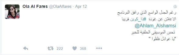 غردت الصحافية الأردنية عبر صفحتها على "تويتر" قاائلة: "رغم الجدل الواسع الذي رافق البرنامج الإعلان عن عودة ذا كوين قريباً، تحس الموسيقى الخلفية للخبر "يا عواذل فلفلوا".