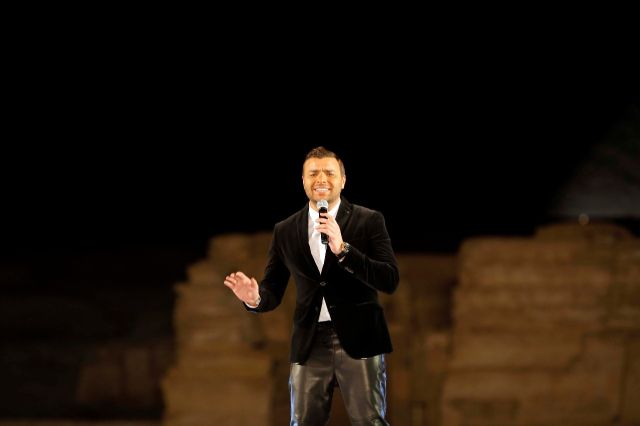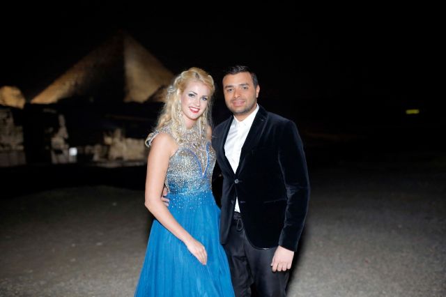 بالصور- رامي صبري يرقص مع ملكات الجمال تحت سفح الأهرامات