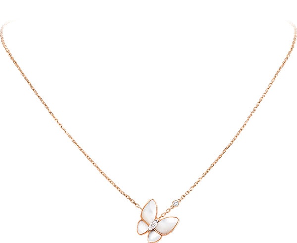 البريق اللطيف لعرق اللؤلؤ يجذب الأنظار مع الذهب الوردي والماس. فما إن تكشف الفراشتان عن ألوانهما القزحية، حتى تشكلا زوجاً من الأقراط الأنثوية الرائعة. كما يتألّق هذا الثنائي الرقيق على خاتم بين الأصابع Between The Finger، بنقشة معكوسة من عرق اللؤلؤ والترصيع الأخاذ، تجسّد اسلوب فان كليف أند آربلز المبتكر. تلتقط الدار الفراشتين في خضمّ رحلتهما، ليصبح هذا المشهد شعارها الأثيري الذي يتجسّد أيضاً في قلادة، تتألق على سلسلة دقيقة رائعة، بجوار بريق ماسة مستديرة.