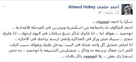 وكتب أحمد حلمي:"شكرًا يا أحمد أوي، أحمد المكاوي ده يا جماعة من إسكندرية و بيدرس في المرحلة الإعدادية، أبو حميد.. بقولك إيه .. أنا عايزك تذاكر تسع ساعات في اليوم أرجوك .. أنا عايزك تنجح .. سيبك مني وركز في المذاكرة وابقي ارسم براحتك في الإجازة".