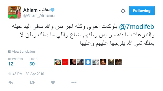 أعربت الفنّانة الإماراتية أحلام عن عميق حزنها لما يجري في مدينة حلب تحديداً وسورية عموماً، مؤكدة أنها على استعداد للتبرع بكل ما تملك إذا كانت الأموال تعيد سورياً واحداً.