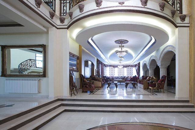 اكتست بعض جدران الصالونات التي توزّعت على ارتفاعات مختلفة، باللون الأصفر وزيّنتها ستائر مشغولة بترف ودقّة.
