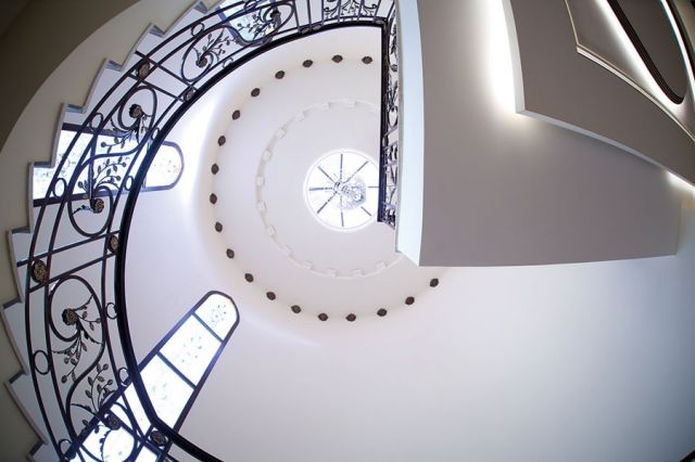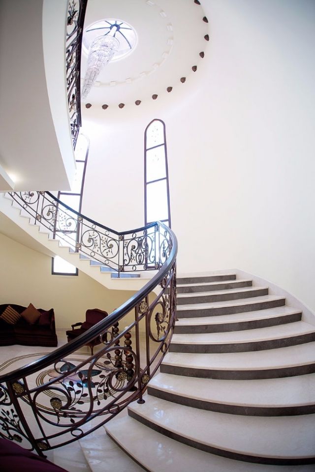 تبرز السلالم محاطة بـ«الفيرفورجيه» والنحاس ومزخرفة برسوم وردية تجاورها نوافذ زجاجية مختلفة الأحجام منفّذة من الزجاج الملون المطبوخ لتبدو كلوحات مضاءة!