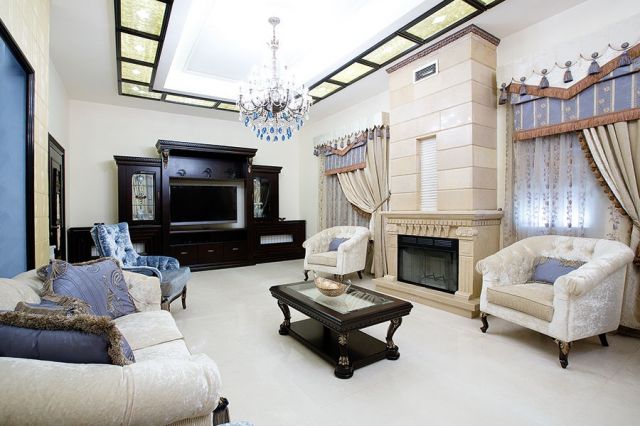 شمالاً، يطالعنا صالونان آخران، إضافة إلى غرفة شتوية مخصصة للمعيشة (الجلوس)، يطغى فيها اللونان الأزرق والبيج وتحاكي الطراز النيوكلاسيكي. وفيما تحتلّ حيزاً منها جلسة شبه دائرية، تشغل مدفأة من الحجر الطبيعي مع «فيترين» وتلفاز كبير حيّزاً آخر. وتميز السقف بديكور فريد تتدلى منه ثريا متلألئة بحبّات الكريستال البيضاء والزرقاء!
