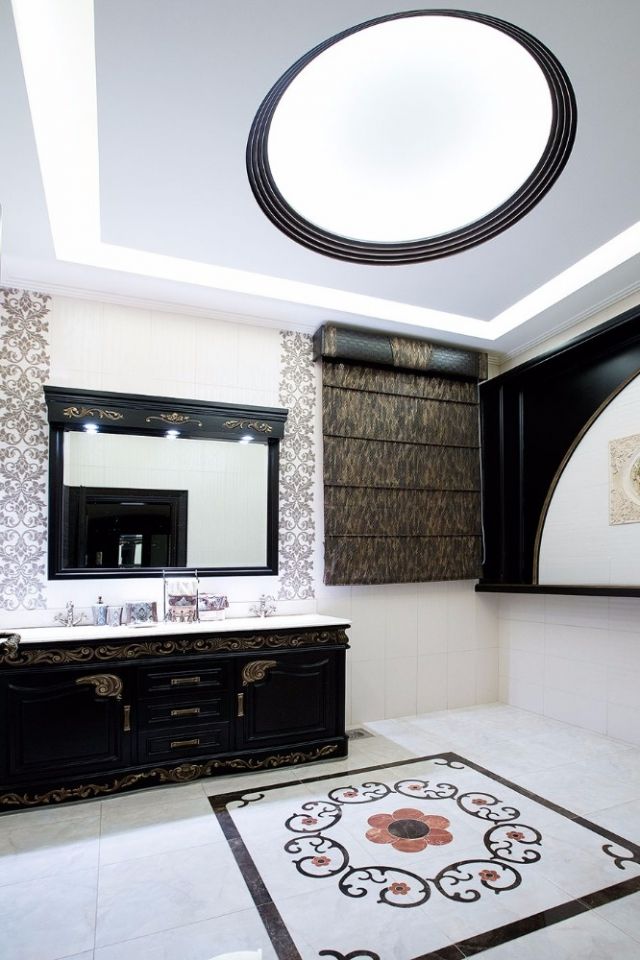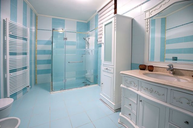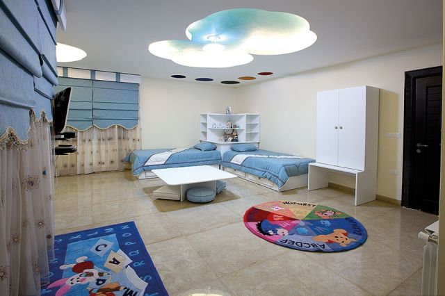 الأزرق سيطر على غرفة نوم أخرى بدءاً من سقفها، نزولاً إلى الستائر ووصولاً إلى الأرائك، بينما اتخذ اللون الأبيض مكانته في خشب الأسرّة والخزائن بطراز كلاسيكي وزخرفات راقية تمتدّ إلى الحمام المجاور الخاص بالغرفة.