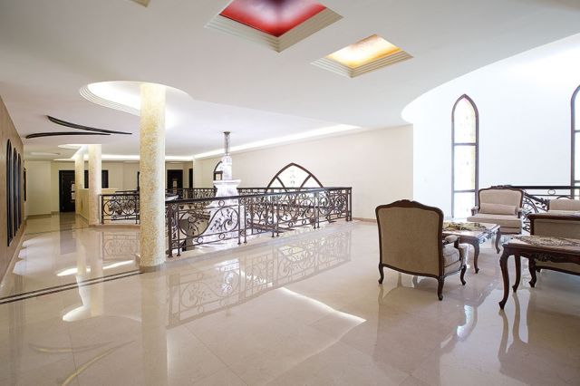 وفي العودة إلى الردهة الرحبة الرئيسة، تبرز عند أسفل السلالم زاوية بلون الأحمر القاني، مخصصة لجلسات جانبية تليق بالمناسات الكبيرة أو الرسمية، حيث تتواصل السلالم لتنتهي عند ثريا رائعة من الكريستال.